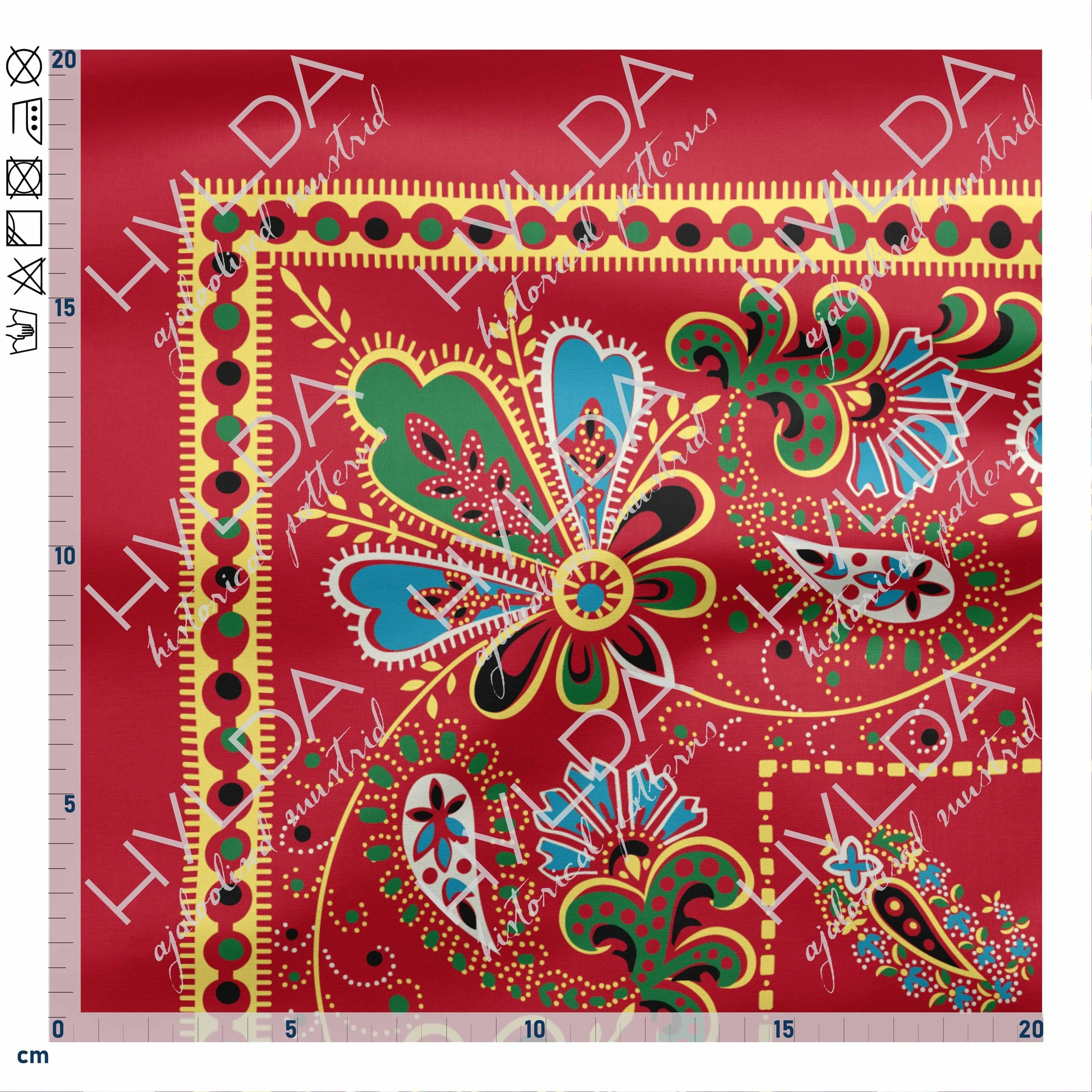 Care instructions: Hand wash or delicate cycle max 40°C. Low spin max 400 rpm. Use phosphate‑free detergent. Do not bleach. Do not spot‑clean or rub wet prints. Air‑dry only (no tumble dry). Iron cotton setting max 200°C. Fully printed fabrics: iron from the reverse side.
